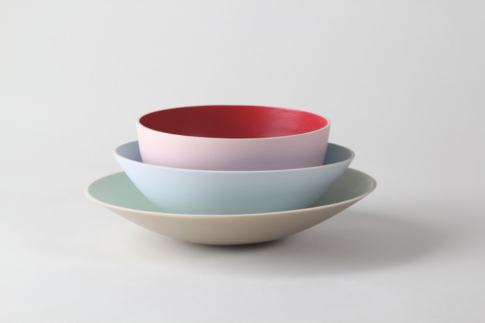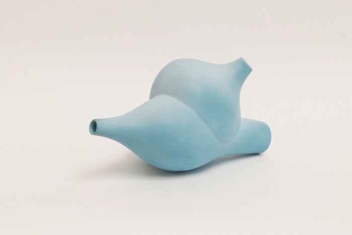 Das Spiel mit der Form ist es, was Christine Ruff antreibt und sie an ihrer Arbeit fasziniert. Je größer diese sei, desto schwieriger sei sie zu handhaben, verrät die Designerin. Wer sich im Atelier umsieht und die riesigen Gefäße betrachtet, kann sich ungefähr ausmalen, wie anspruchsvoll die Herstellung wohl war. Etwa ein halbes Jahr feilte Christine Ruff an der ersten Gießform, als sie sich 2004 selbstständig machte. Denn darum geht es: Nichts anderes als die reine Form. Einfachheit und Eleganz zieht sich wie ein roter Faden durch ihre Kollektion. Bewusst unterläuft sie dabei den vielzitierten Designgrundsatz „Form follows function“und bewegt sich so zwischen Kunst und Design, Raumobjekt und Gebrauchsgegenstand. Meist entsteht aus einer Skulptur eine Serie mit mehreren Objekten, deren Formen sich voneinander ableiten. So kann sich die nächste Variation einer Schalenvase beispielsweise um das Maß des Randes vergrößern oder verkleinern. Durch diese festgelegten Parameter entsteht dann die Vielfalt einer. Ein Element, beispielsweise ein Standfuß, bleibt dabei immer gleich. Das klingt sehr systematisch und planvoll: Aber auch aus Missgeschicken und Zufällen zieht die Keramikerin schöpferische Energie. Beim Herausnehmen einer eigentlich als rotationsgleich gedachten Schale aus dem Negativ verformte sich diese. Ein Effekt, der sich beim Brennen im Ofen dann noch verstärkte. Doch anstatt neu anzufangen, nutzte Christine Ruff dieses zufällige Moment, unterstützte die Deformation bewusst und kreierte so die Serie „Schwammerl“. Zur Kollektion der Wuppertaler Künstlerin, die mit ihrem klaren und eleganten Stil den Zeitgeist trifft, gehören unter anderem Bauchvasen, Wackelschalen, Kelchschalen und Flaschen- oder Kugelvasen, aber auch Wandteller. Bemerkenswert sind die Paarvasen, die sich in ihrer Form ergänzen: Der Bauch der ersten Vase wird von einer entsprechenden konkaven Linie der zweiten aufgenommen. So schmiegen sich beide Objekte wunderbar aneinander. Ihr Portfolio spiegelt auch die Entwicklung in ihrem Schaffen wider. Anfangs waren alle ihre Kreationen rein weiß, heute meist ein- oder zweifarbig in Pastelltönen gehalten, Muster sind in ihren Arbeiten aber ebenso zu finden. „Ich liebe es, mit den einfachsten Mitteln das bestmögliche Ergebnis zu erzielen“, erklärt sie – und so kann beim Bemalen einer Schale auch mal ein Spitzendeckchen oder ein Baumwolltuch behilflich sein.