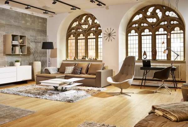 Ventana is an owner-managed company with products by international top manufacturers of elegant interior concepts for home and office. The shop itself, a former carpark in the middle of Münster, is a real eye-catcher: in "white cube" style and loft atmosphere, 1.400 square meters of design originals - furniture, lighting and accessories, can be admired and purchased. The original reinforced concrete structure is not hidden but instead, together with the nine-meter-high glass façade, forms a fitting background to modern furniture and lighting. The shop itself is therefore a plea for giving the skillful conversion the advantage over often faceless and historyless new buildings.